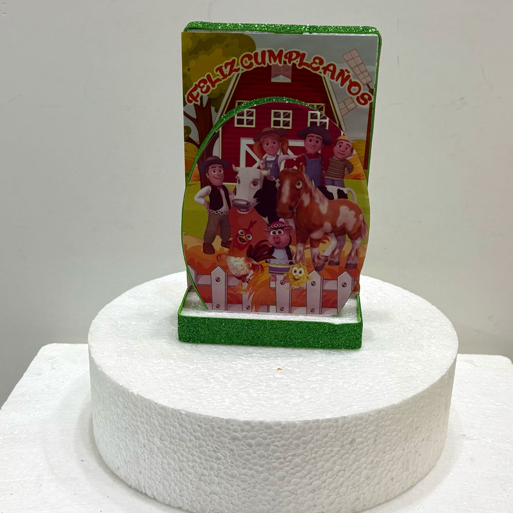 Las cuales son el fondo vertical que delante lleva la imagen principal sobre una base rectangular, las 3 partes traen un contorno hecho con cartulina de glitter.